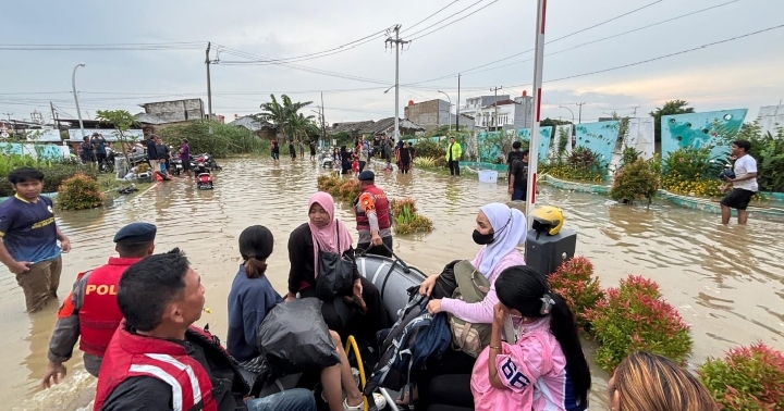 Brimob Polda Metro Jaya Terus Evakuasi Warga Terdampak Banjir di Perumahan The Nebraska Terrace