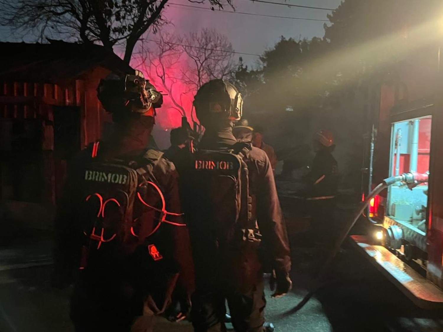 Personel Batalyon D Pelopor Brimob langsung mengamankan lokasi guna mencegah potensi gangguan keamanan selama proses pemadaman berlangsung.