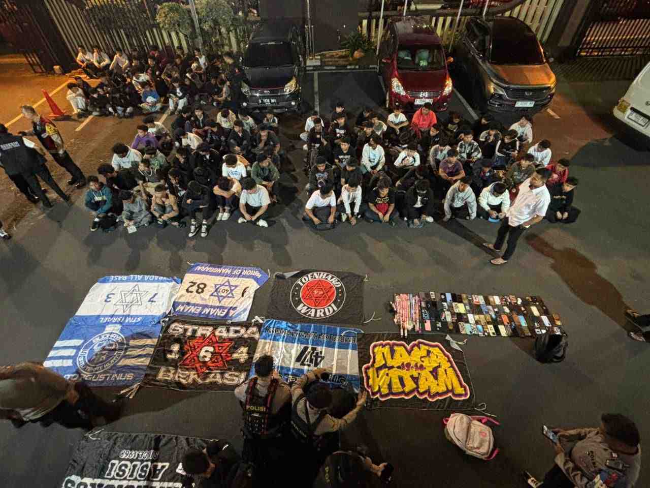 Petugas juga mengumpulkan barang bukti berupa puluhan handphone, kembang api, flare, dan sepeda motor.