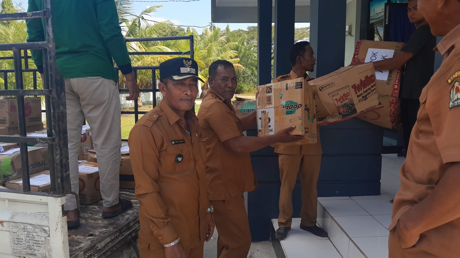 Ketua Apdesi Kecamatan Meurbo menerima bantuan dengan didampingi staf Dewan Pimpinan Kecamatan untuk mempercepat penyaluran ke masyarakat.