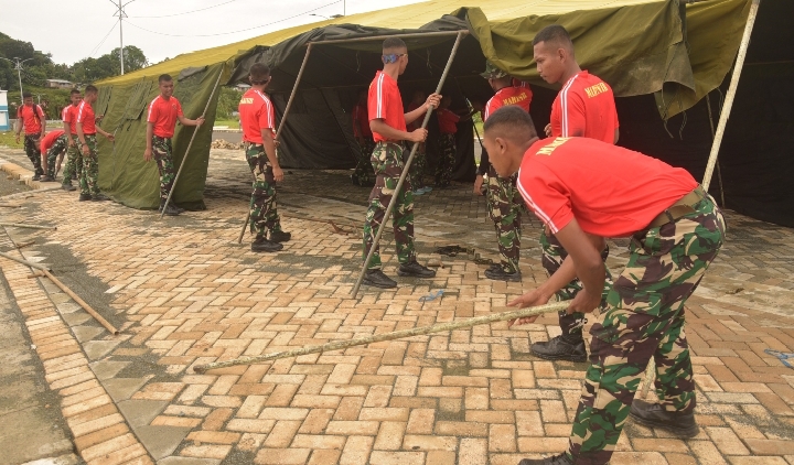 Prajurit Denmako Pasmar 3 Siapkan Tenda Serbaguna Sambut Pasar Murah HUT TNI ke-80
