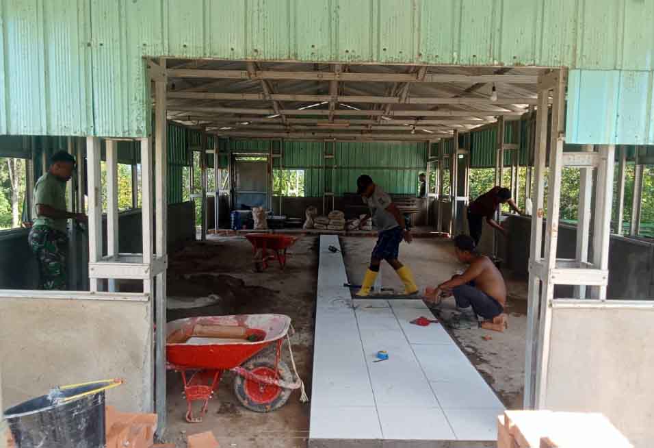 Kini, proses pemasangan keramik dilakukan dengan penuh ketelitian oleh anggota Satgas dan masyarakat, yang bahu-membahu sejak pagi hingga sore hari agar target penyelesaian dapat tercapai tepat waktu.